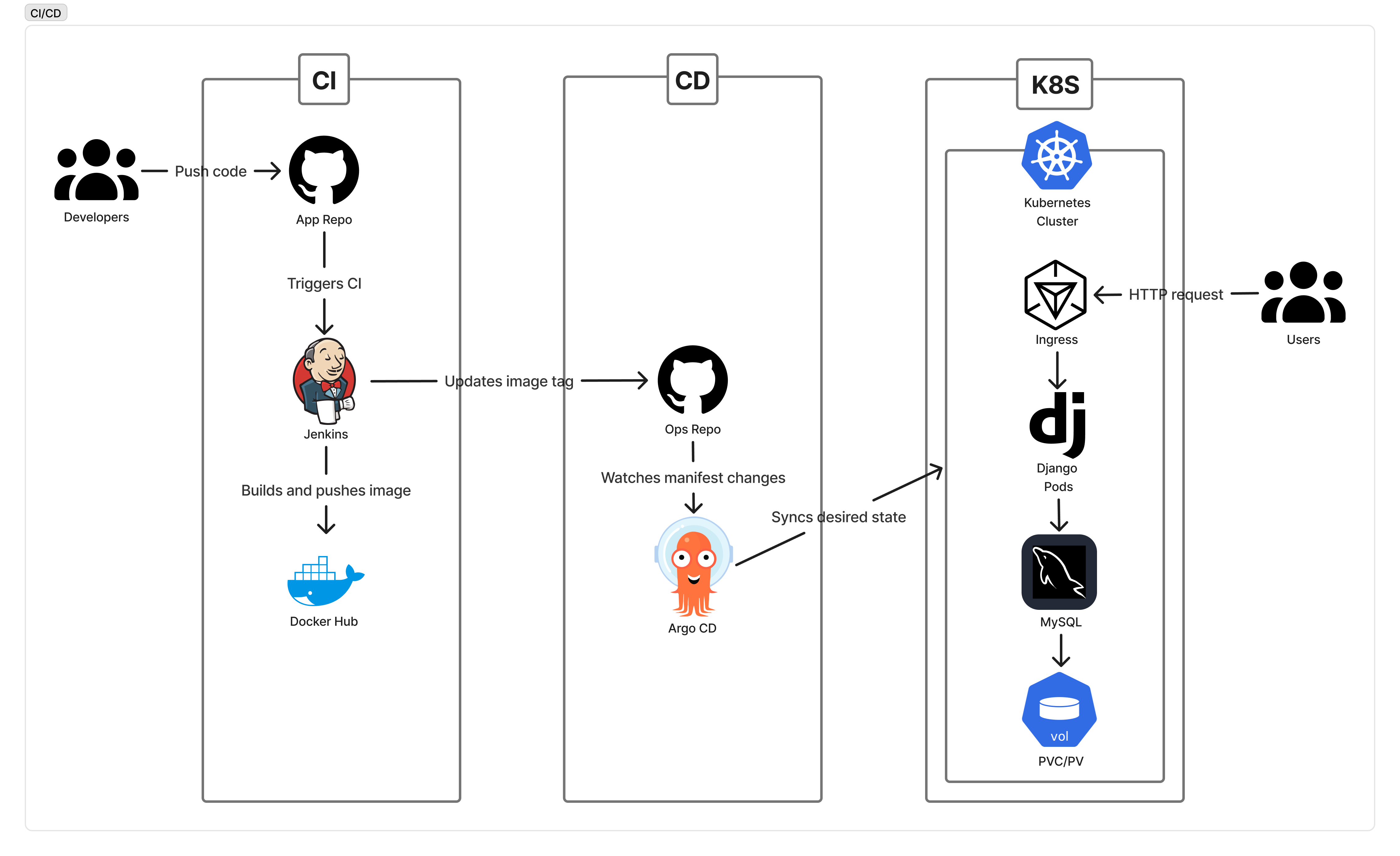Jenkins가 Ops Repo의 이미지 태그를 갱신하고, Argo CD가 변경된 배포 설정을 감지해 Kubernetes 클러스터와 동기화합니다.