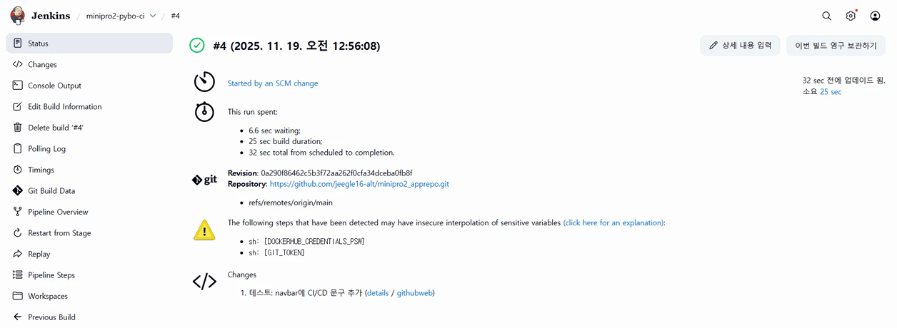 App Repo에 코드가 반영되면 Jenkins가 실행되어 새로운 Docker 이미지를 빌드하고 Docker Hub에 푸시합니다.