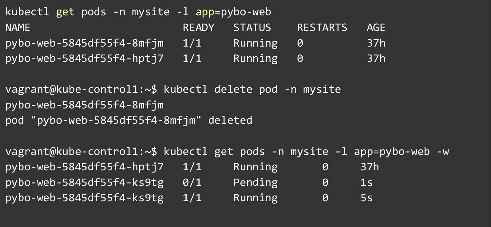 실행 중인 Pod를 강제로 삭제한 뒤, ReplicaSet이 새로운 Pod를 자동으로 생성해 서비스 상태를 복구하는지 확인했습니다.